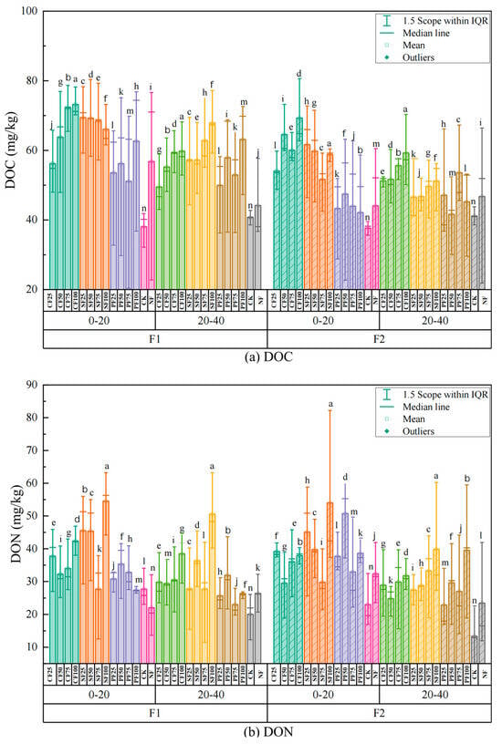 Figure 6 and Figure 7, as well as Table 3 and Table 5, show the results of an analysis of the average values of the NH4+-N, NO3−-N, DOC, DON, MBC, and MBN in the 0–20 and 20–40 cm soil layers during the growth period of the salinized farmland. As shown in Table 3, under different fertilizer application ratios in F1, the NH4+-N and NO3−-N levels demonstrated no significant differences. The different types of organic fertilizers demonstrated the following orders: NF > PF > SF > CF and SF > NF > CF > PF. Compared to conventional fertilization, the application of different CF, SF, and PF ratios under N reduction conditions reduced the soil NH4+-N by 20, 13.4, and 3.2%, respectively, as well as reduced the soil NO3−-N by 21.5, −2.6, and 22.6%, respectively. The DOC and DON levels demonstrated the following orders: 50 > 75 > 25% and 75 > 50 > 25%. Compared to NF, the application of different CF, SF, and PF ratios under N reduction conditions increased the soil DOC by 26.9, 25.3, and −0.7%, respectively, as well as increased the soil DON by 33.3, 59.3, and 33.3%, respectively. The MBC and MBN levels demonstrated orders of 50 > 25 > 75% and 25 > 50 > 75%, respectively, with the MBN increasing as the proportion of organic fertilizer increased (and TN decreased). When the organic fertilizer ratio was 50%, the soil MBC and MBN contents were highest. Compared to the NF, which reduced the soil MBC and increased MBN content, the application of commercial organic fertilizer increased the MBC and MBN by 37.1 and 65.6%, respectively.