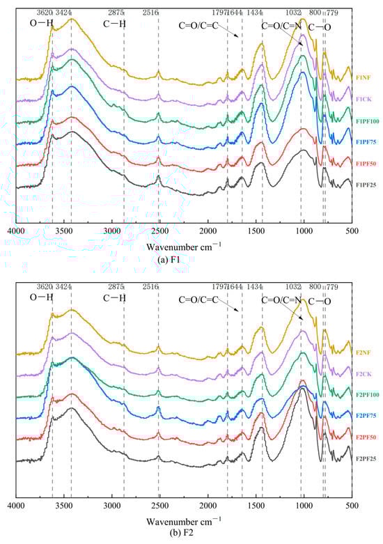 The infrared spectra of the soil surfaces under different organic and inorganic fertilizer rates and inorganic fertilizer rates in 2022. (a) The F1 soil organic carbon functional groups. (b) The F2 soil organic carbon functional groups.