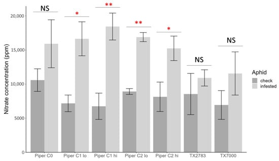 Nitrate concentration ± SE (ppm) of selected Sudangrass Piper lines (lo = low nitrate and hi = high nitrate) and susceptible (TX7000) and resistant (TX2783) sorghum genotypes for plants infested with sorghum aphid Melanaphis sorghi (Theobald) (Hemiptera: and check plants. NS = no significant difference according to a t test (α = 0.05); * = significant difference (p < 0.05); ** = significant difference (p < 0.01).