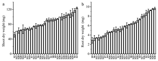 The Cd content in the shoots and roots (on a dry weight basis) both showed obvious difference between the 30 different cultivars. The variation in Cd content in the shoots ranged from 49.36 μg·g−1 for S15 (BN067) to 146.44 μg·g−1 for S30 (LV35), with an average level of 93.63 μg·g−1. And the Cd content in the shoots of high-Cd cultivar was 2.97 times that of the low-Cd cultivar (Figure 2a). The range of Cd content in the roots of different rapeseed cultivars varies from 734.74 μg·g−1 (S15: BN067) to 3306.87 μg·g−1 (S24: ZQ484), and the Cd content in the roots of high-Cd cultivar was 4.51 times that of the low-Cd cultivar (Figure 2b).