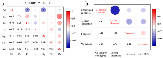 Correlation of various nutritional elements in shoots of 26 different cultivars of rapeseed (a); the correlation between transport coefficient, root cadmium absorption, and iron and magnesium content (b).