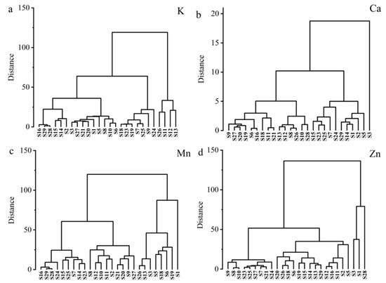Cluster analyses of K (a), Ca (b), Mn (c), and Zn (d) in shoots of 26 rapeseed cultivars.