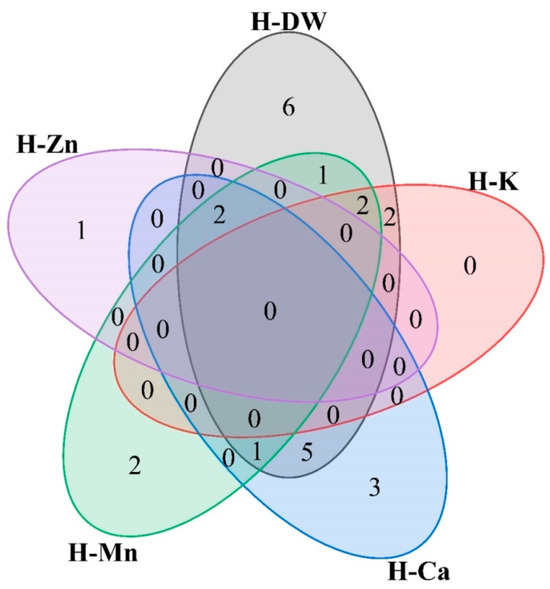 Venn diagram of different advantageous cultivar groups from 26 rapeseed cultivars with lower Cd content in shoots. The five ellipses represent rapeseed cultivars with five characteristics. H-K represents high K content cultivars, H-DW represents high dry weight cultivars, H-Ca represents high Ca content cultivars, H-Mn represents high Mn content cultivars, H-Zn represents high Zn content cultivars.