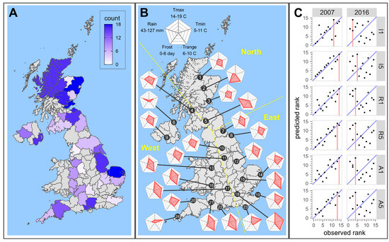 Trial distribution, climate variation, and yield prediction: (A) Geographical distribution of UK counties with spring barley trials. (B) Climate variation from north (1) to south (24) and separation of trial sites into three regions (North, West, East). (C) Predicted versus observed yield ranks from six methods in 2007 and 2016 at Coaltown of Balgonie, which is located in Fife, Scotland, and close to weather station 3.