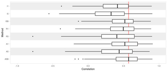 Comparison of eight different methods for predicting variety performance. Each boxplot contains correlations between predicted and observed yield ranks from 29 unique trial sites and 13 years (2007 to 2019). The lower, middle, and upper hinges of the boxplots represent the first, second (median), and third quartiles of the data points. The whiskers extend from the boxes to the furthest data points within 1.5 times the interquartile range. The vertical red line serves as a reference based on the largest median correlation from method A5B.