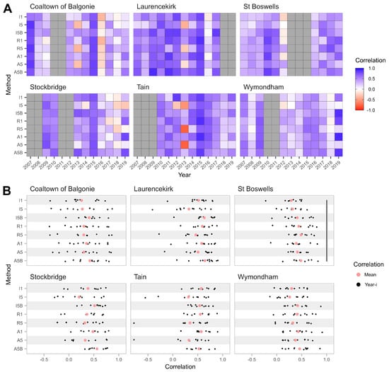 Correlations between predicted and observed yield ranks in six trial sites: (A) Heatmap of correlations for eight methods and 13 years. These six trial sites are highlighted here because they have the greatest number of trials across the years. (B) Scatter plot of correlations for eight methods and 13 years. Significant difference in mean correlations between methods after applying Bonferroni correction is indicated by a black vertical line.