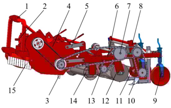 The traditional method of crop residual film disposal is mainly burning and burying, which not only pollutes the air environment but also damages the soil quality and the ecosystem [7,8]. In recent years, with the continuous development of science and technology, mechanized residual film recycling technology has begun to emerge, and experts and scholars at home and abroad have developed many types of residual film recycling machines. For example, Gansu Agricultural University developed the canvas belt potato digging residual film recycling joint operation machine. China, Shandong, Fangcheng Agricultural Machinery Co. developed the 18CM-130A7 residual film recycling bundling machine [9]. Other examples include China, Jiangsu, Changzhou Hansen Machinery Co., Ltd. in Xinjiang [10], the 4CMJ-2.0 integrated residual film recycling and straw return machine developed by American scholars Sawyer and Roberson, and the hydraulic residual film recycling machine developed by Israel [11]. Although residual film recycling technology has made great progress, thus alleviating the traditional manual recycling method’s inefficiency and high cost, the existing residual film recycling machine still presents some problems, such as film and seedling entanglement in potato planting plots, resulting in a poor separation effect. The residual film recycling device’s operation is unstable, prone to the entanglement congestion phenomenon, etc. [12].