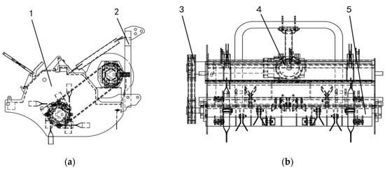 Schematic diagram of the structure of the seedling killing device: (a) side view; (b) main view. 1. Shield worm shell. 2. Three-point suspension device. 3. Belt drive mechanism. 4. Gearbox. 5. Knife dumping roller.
