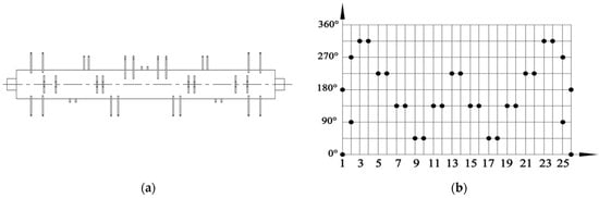As shown in Figure 3a, the length of the dumping knife roller is 1100 mm, the interval of knives on the edge of the ridge is 80 mm, and the interval of knives on the ridge is 120 mm. As shown in Figure 3b, the overall tool is divided into 15 groups, with 4 groups of tools installed on the edge of the ridge and 2 tools installed on the same rotary plane. The tool phase angle is 180°, and 11 groups of tools are installed on the ridge. Four tools are installed on the same rotary plane, and the tool phase angle is 90°.