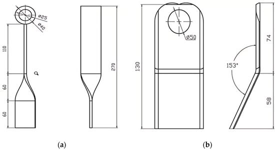 In order to improve the machine to kill the quality of rice seedlings, work efficiency, while reducing the damage of the tool on the potato, the design of the tool to take the edge of the monopoly dumping knife and the monopoly dumping knife two kinds of knives, as shown in Figure 4. The knife is connected to the knife roller through the pin articulation, and the connection hole is large to ensure that the seedling killing knife can be properly adjusted to fling. In order to conform to the shape of the ridge, the knife is designed as a slanting knife, which can reduce the cutting resistance of the knife and facilitate the knife’s ability to break the potato stalks. In order to increase the contact area between the seedling killing knife and potato straw, the knife on the ridge is designed as a bending type. If the tool’s bending angle is too small, it is easy for weeds and straw on the ridge to become entangled. On the contrary [14], the potato straw, if broken, cannot be effective, thus affecting the film surface cleaning effect. After analysis, the bending angle of the knife throwing was set to 30°.