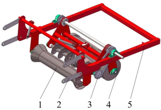 The spiral soil driving device, shown in Figure 8, mainly consists of a drive shaft, a spiral support beam, a pair of connecting plates, a chain drive, and a spiral mechanism designed. The main purpose of the design is to solve the problem of film-soil-seedling entanglement, to provide a recycling occasion for the residual film recycling device before the operation, and to clean the residual film surface on the ridge with more residual seedlings and soil and other impurities to the bottom of the ridge.