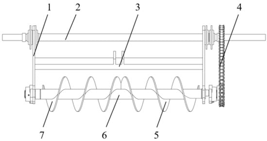 Schematic diagram of auger driving device. 1. Connecting plate. 2. Drive shaft. 3. Spiral support beam. 4. Chain drive. 5. Right-hand spiral blade. 6. Spiral shaft. 7. Left spiral blade.