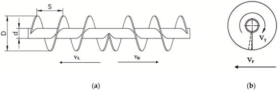 During the working process, the soil seedlings and other accumulated materials on the ridge are separated from the middle position of the ridge and fall down to the two ends of the ridge under the spiral blade, which can clean up the debris on the film surface and complete the cleaning of the film surface. The working schematic diagram of the spiral soil repellent device is shown in Figure 9. When the machine is in operation, the screw unit rotates in a clockwise direction from the left side of the machine according to the power transmission. Left-rotating and right-rotating screw blades convey in the direction of v left, v right. v front represents the forward direction of the implements, v turn represents the rotating direction of the spiral soil repellent device, S represents the distance from the membrane gap, d represents the rotating shaft’s diameter, and D represents the diameter of the spiral blades.