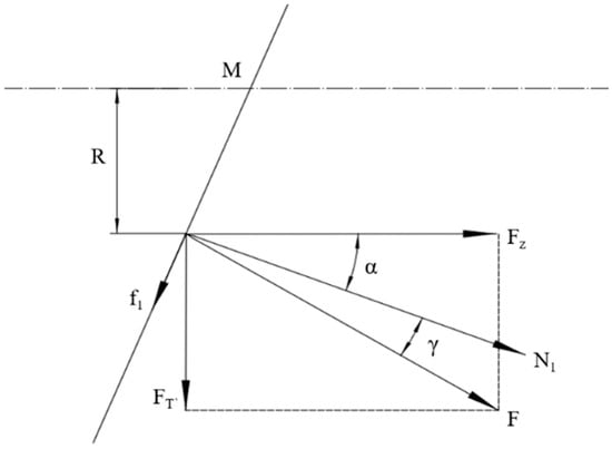 Potato straw force in horizontal plane. α is the helical angle of lift of the spiral blade; N1 is the normal thrust of the potato residual seedling by the spiral blade; f1 represents the potato residual seedlings in the tangential direction of the spiral blade to produce friction; The F-force is obtained by the friction force that causes the normal thrust of the potato stump to deviate by an angle; the angle of deviation of the normal thrust is approximated as the equivalent angle of external friction of the potato stump γ. The F-force is obtained by the friction force that causes the normal thrust to deviate by an angle.