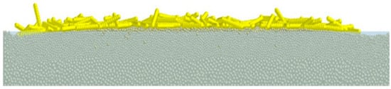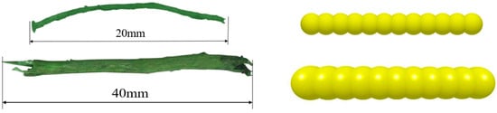 In order to make the simulation process close to the actual situation and to avoid the influence of the simulation’s soil trough boundary on the simulation test results, a soil trough model with a length × width × height of 1800 mm × 1000 mm × 400 mm and a potato straw model with a length of 30~50 mm were established. The soil tank was set up to generate two types of soil particles divided into upper and lower layers, and the soil particle bed was modeled as shown in Figure 11 [18,19]. The long potato straw base model consisted of spherical particles with a radius of 5 mm to form columnar straw particles, and the short straw consisted of 3 mm spherical particles. The long potato straw was set to generate 50~100, and the short straw particles were set to generate 100~150, which were randomly distributed on the already established soil model. The potato straw model is shown in Figure 12. The soil, straw, and auger device material parameters and the contact parameters between them were set in accordance with the simulation parameters of the seedling killing device above.