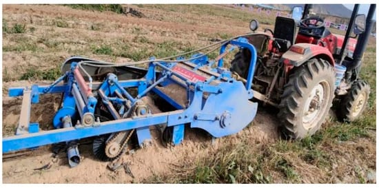 - Ma, Y.; Yang, S.; Li, M.; Wang, Q.; Ke, Z. Design of a Potato Harvester and Residual Film Recovery Machine for Complex Terrain. J. Hebei Univ. (Nat. Sci. Ed.) 2022, 42, 569–579. [Google Scholar]