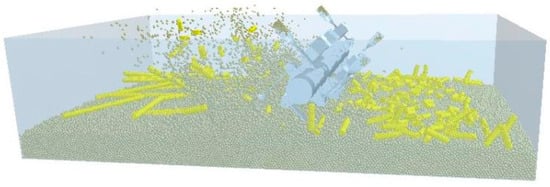 Figure 19 shows the potato seedling killing device during the crushed potato straw process simulation. From the simulation test figure, it can be seen that regarding the seedling killing device in the ridge after operation, part of the potato straw at the back end of the machine falls, and the small dump knife group crushed the potato straw smaller. The edge of the ridge by the large dump knife group crushed potato straw larger because the straw on the ridge needs to present a broken small shape to be able to satisfy the subsequent film cleaning device transport cleaning. The potato straw on the edge of the ridge only needs to be separated from the straw on the ridge, falling into the two sides of the ridge can be realised to return the potato straw to the field, the simulation test on the ridge and the edge of the ridge to kill seedling is shown in Figure 20. In the process of potato seedling killing device crushing potato straw, the soil particle model partially adheres to the surface of the dumping knife group, making the knife group with the increase in operating time, the knife group sharpness decreases, affecting the effect of seedling killing [24].