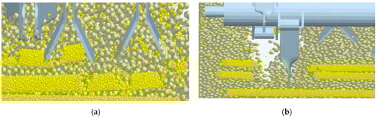 The distribution of particle positions on the ground and on the ridge at different auger speeds is shown in Figure 23. As the rotational speed of the spiral churn increases, the 7th group of straw particles is more distributed on the surface of the ridge. Part of Yong blocked the front end of the spiral driving device, and the number of straw particles on the ground is reduced. The 9th group of straw particles is more distributed on the surface of the ridge, and more straw particles are splashed on the ground. Some of them splashed beyond the ground of the specified area, and straw particles that are out of the area are out of the computational domain and not shown. From this, it can be initially judged that the amount of material conveyed increases as the speed of the screw churn increases.