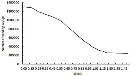 Figure 21 shows the potato particles between the number of bonding bonds and the simulation time change curve. From the figure, it can be seen in the potato straw bonding model’s number of change rule that at the beginning of the change in the amount of bonding bonds is small. At this stage, the dumping knife and the potato straw particles have not yet produced contact and the straw particles are still bonded together. With the advancement of the knife roller and the rotation of the knife group, the knife group contacted the straw particles, and the straw particles were broken. The number of bonded particles began to decrease rapidly, and the straw crushing rate reached 91.2%, which achieved the expected effect.