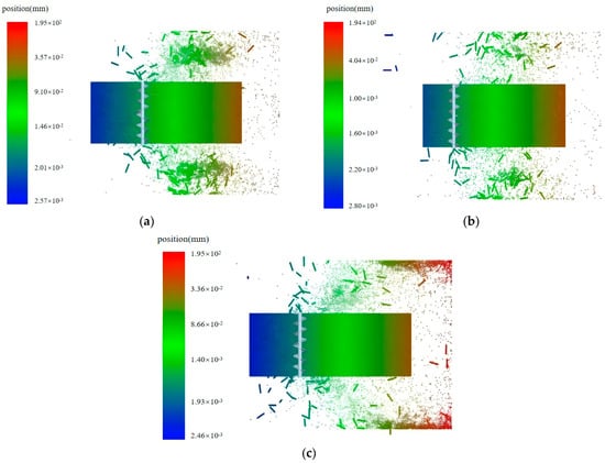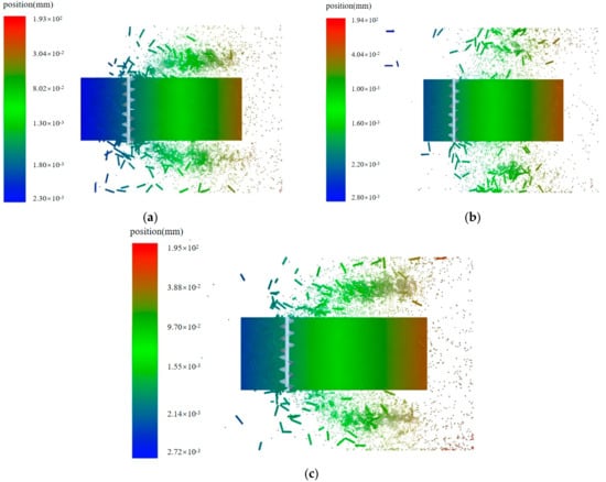 Positional distribution of straw particles with different screw churn speeds. (a) Speed of rotation 500 r/min. (b) Speed of rotation 600 r/min. (c) Speed of rotation 700 r/min.