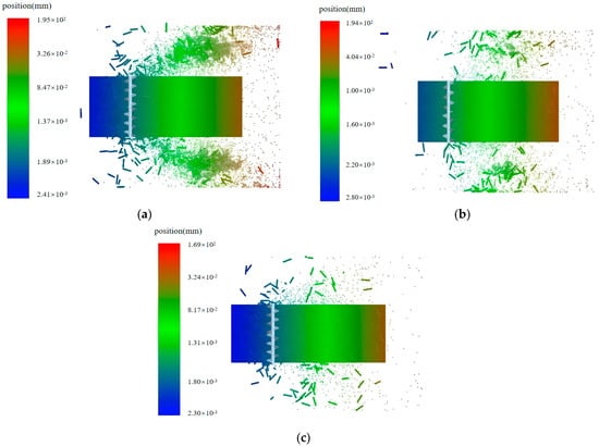 Positional distribution of straw particles with different forward speeds: (a) forward speed of 0.3 m/s; (b) forward speed of 0.8 m/s; (c) forward speed of 1.4 m/s.