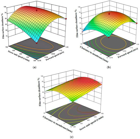 The data were processed using Design-Expert13 software to derive the response surface of the significant interaction between the forward speed of the machine, the rotational speed of the spiral stirrer, and the distance from the film gap and their impact on the film surface cleanliness, as shown in Figure 25.