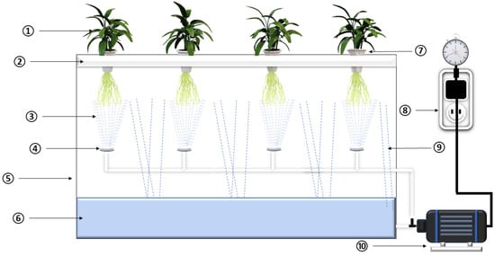Schematic view of aeroponic system: 1. Plant; 2. Plant supporting raft; 3. Nutrient mist; 4. Misting nozzle; 5. Growth chamber; 6. Nutrient solution; 7. Plant holder; 8. Timer; 9. Nutrient dropdown; 10. Pump.