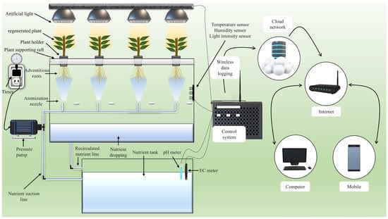 Plant propagation is a technique of producing new plants from a stock plant. There are many methods to propagate plants, including taking cuttings from leaves, stems, or roots to generate new plants from these tissues. Other methods include grafting and layering [1]. Propagation is either sexual or asexual. Sexual propagation produces new plants from seeds at a modest rate of reproduction involving genetic recombination. Plants typically require more time to establish and mature due to the developmental stages involved [2]. Because of genetic variability, sexual propagation cannot produce true-to-type plants from seeds, especially where maintaining specific traits, like hybrids or cultivars, is crucial [3]. However, doubled haploid plants and inbred lines are exceptions. Due to their uniform genetic makeup and reduced variability, they are typically true-to-type. Asexual propagation has integrated the conveyance of stock plant’s genetic characteristics to progeny; it enables replicating plants with limited or no seed production, along with flexible production scheduling, because it is no longer dependent on the bearing (fruiting) seasons [4]. This asexual propagation method preserves traits and accelerates plant growth; such grafted bushes begin to blossom in less than 5 years, as opposed to 8–23 years for seed propagation [5]. Sexual reproduction of hybrid seeds and interspecific crossbreeds cannot yield true-to-type plants [6]. At the same time, asexual propagation can be obtained genetically similar to that of an individual parent. This propagation method can also rapidly mass-produce many cloned plants [7]. Table 1 provides a list of plants regenerated using various rapid propagation approaches. This review presents a novel use of intelligent aeroponic technology for rapid asexual propagation. In contrast to earlier research, this study focuses on the fusion of sensor-based and IoT technologies, enabling real-time control and optimization, a significant improvement over the conventional propagation approach. The objective of this review is to explore the potential of intelligent aeroponic systems for rapid asexual propagation, evaluate their impact on asexual smart plant production, and assess their viability in conserving species and improving asexual methods of propagation rapidly.