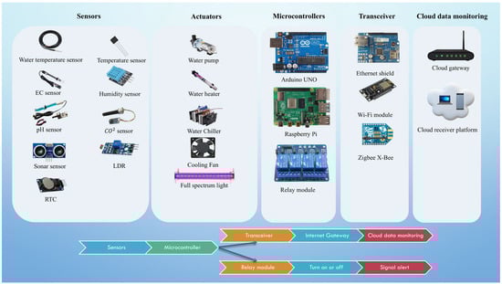 - Rahman, F.; Ritun, I.J.; Ahmed Biplob, M.R.; Farhin, N.; Uddin, J. Automated Aeroponics System for Indoor Farming using Arduino. In Proceedings of the 2018 Joint 7th International Conference on Informatics, Electronics & Vision (ICIEV) and 2018 2nd International Conference on Imaging, Vision & Pattern Recognition (icIVPR), Kitakyushu, Japan, 25–29 June 2018; pp. 137–141. [Google Scholar]
