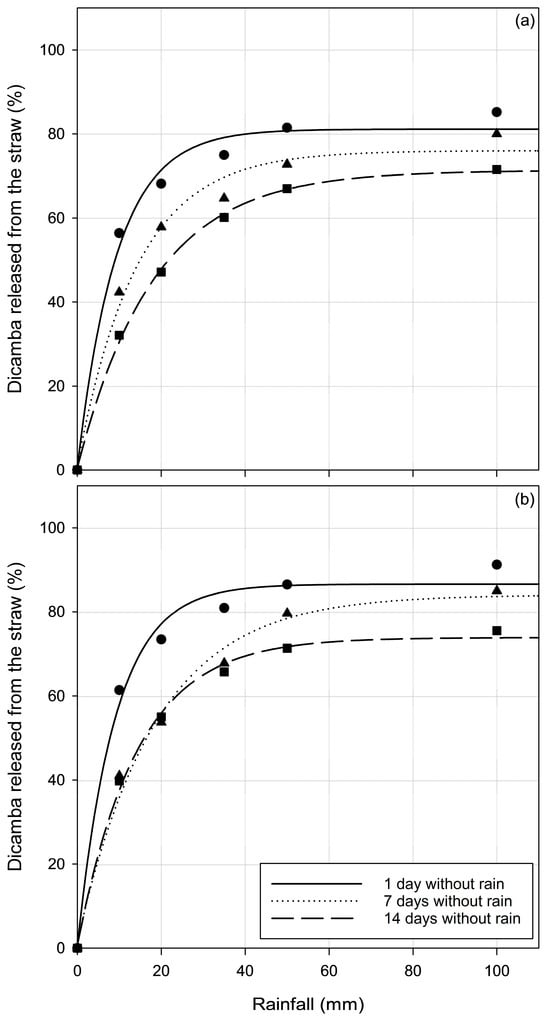 2.2. Studies 3, 4, and 5—Weed Control Efficacy and Dicamba Availability: Different Amounts of Maize Straw, Periods without Rainfall, and Dry and Wet Mulch