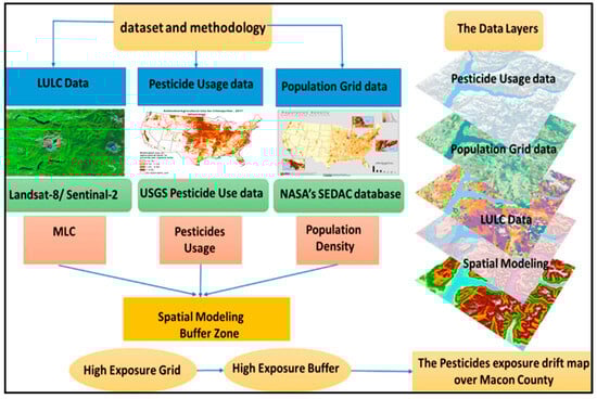 - El Afandi, G.; Ismael, H.; Fall, S.; Ankumah, R. Effectiveness of Utilizing Remote Sensing and GIS Techniques to Estimate the Exposure to Agricultural Pesticides Drift over Macon, Alabama. Agronomy 2023, 13, 1759. [Google Scholar] [CrossRef]
