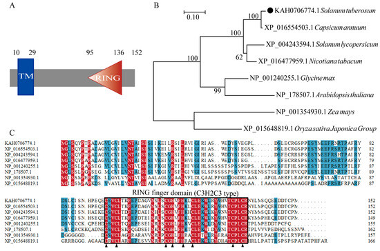 StXERICO1, a RING-H2 type E3 ubiquitin ligase, from Solanum tuberosum L. (A) Structure of the StXERICO1 protein showing the transmembrane domain (TM) and RING domain. (B) Phylogenetic tree of StXERICO1 from different plant species. The unrooted neighbor-joining phylogenetic tree based on StXERICO1 homologs was created using MEGA7.0. (C) The amino acid sequences of StXERICO1 and different plant species were aligned using ClustalW. The RING finger domain is highlighted by a black box, with the positions of cysteine (C) and histidine (H) indicated by black arrowheads. Identical amino acids are represented in red, while similar amino acids are shown in blue.