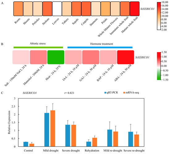 Expression patterns of StXERICO1 in various organs of potato plants and its response to different treatments. (A) StXERICO1 expression patterns across various organs of the potato plant. (B) Differential expression of StXERICO1 in response to different treatments in potato plants. (C) Expression analysis of StXERICO1 by qRT-PCR (blue) and RNA-seq (orange). The Pearson’s correlation coefficient (r) is indicated in the upper middle corner. All expression values were normalized by dividing the means of the six treatments.
