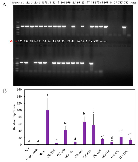PCR verification (A) and qRT-PCR analyses (B) of StXERICO1 between WT, empty vector, and transgenic potato lines. Each bar indicates the mean ± SD from three biological replicates. Different letters indicate statistically significant differences (p ≤ 0.05). CK+: template is positive plasmid, CK−: template is WT, Water: template is water. The numbers represent different transgenic potato lines.