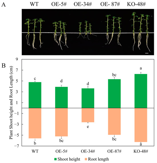 Effects of overexpression and knockout of StXERICO1 on shoot and root growth in potato plantlets. (A) Phenotypic observation of transgenic lines and wild-type potato plantlets. (B) Measurement of shoot height and root length in potato plantlets. Representative pictures were taken after 2 weeks of tissue culture. Scale bar, 1 cm. Different letters indicate statistically significant differences (p ≤ 0.05).