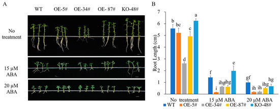 To test the responses of these transgenically modified potato lines to ABA sensitivity, terminal shoots from potato plants of the same age were cut to equal lengths and transplanted into MS medium without ABA and with 15 or 20 µM ABA, respectively. After two weeks of culture, the growth phenotype was observed, and the length of regenerated roots was measured. As shown in Figure 6, after two weeks of treatment with 15 µM ABA, both the transgenic lines and WT exhibited decreased root growth; notably, the OE-5# line showed almost no rooting. Following two weeks of 20 µM ABA treatment, it was evident that the WT could still root to some extent, while the three overexpression lines showed almost no root development (Figure 6, the WT control shows a root length of 0.99 cm). On the other hand, the rooting performance of the knockout line KO-48# was similar to those of the wild type (WT) when grown in an MS medium supplemented with 15 or 20 µM ABA (Figure 6).