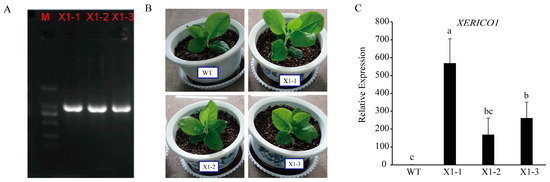 PCR verification (A), growth phenotype observation (B) and qRT-PCR analysis of XERICO1 mRNA levels (C) in WT and three independent T1 transgenic tobacco lines. Each bar indicates the mean ± SD from three biological replicates. Different letters indicate statistically significant differences (p ≤ 0.05).
