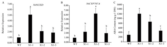 In this study, three transgenic tobacco lines with high expression of StXERICO1 were identified (Figure 8C). NCED, a key gene in the ABA synthesis pathway, and CYP707A, a key gene in ABA metabolism, were analyzed using qRT-PCR. The results showed that the expressions of NtNCED and NtCYP707A increased in these three transgenic lines, overexpressing StXERICO1 to some extent (Figure 10A,B). In addition, the content of endogenous ABA in the transgenic lines X1 and X2 was also significantly increased (Figure 10C), indicating that the overexpression of potato StXERICO1 gene increased the endogenous ABA content in the transgenic tobacco lines.