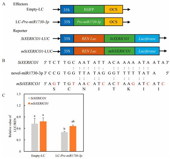 In this study, the sequence pairing StXERICO1 with novel-miR1730-3p was integrated into the pGreenII0800-LUC (LUC) vector to obtain the StXERICO1-LUC recombinant plasmid. Subsequently, mutations were introduced to the target gene sequence sites while maintaining the amino acid sequence unchanged, forming multiple mismatch bases. This modified construct was fused with the LUC vector and named mXERICO1-LUC. A novel-miR1730-3p precursor sequence was cloned from the CIP706205 genome using a Plant Genomic DNA Extraction Kit (Tiangen, Beijing, China). The novel-miR1730-3p precursor sequence was then constructed into the PEZR_(K)-LC vector and named LC-Pre-miR1730-3p. The constructed plasmid was transformed into A. tumefaciens (GV3101, pSoup-P19). Positive clones were selected and cultured overnight at 28 °C with shaking at 200 rpm. The bacteria were then suspended in MMA solution (10 mM MES, 10 mM MgCl₂, 0.2 mM acetosyringone, pH 5.8) until the OD600 concentration reached approximately 0.7–0.8 and were co-transformed into N. benthamiana leaves. Samples were taken from the N. benthamiana leaves infected with A. tumefaciens, and the activity of LUC (Firefly luciferases) and REN (Renilla luciferases) was determined using the Dual Luciferase Reporter Gene Assay Kit (Beyotime Biotechnology, Shanghai, China). Each experiment included three independent biological replicates.