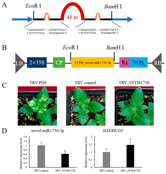 To confirm that novel-miR1730-3p indeed negatively regulated the expression of StXERICO1 in potato, a novel-miR1730-3p gene silencing vector was constructed using virus-based microRNA silencing technology (Figure 13A,B). As shown in Figure 13C, the novel-miR1730-3p gene-silenced potato plants (TRV_STTM1730) were successfully obtained. Compared with the TRV control, StXERICO1 expression was significantly up-regulated in the novel-miR1730-3p-silenced plants (TRV_STTM1730) when novel-miR1730-3p expression was inhibited in the novel-miR1730-3p-silenced plants (Figure 13D). These experiments conclusively demonstrated that novel-miR1730-3p can target and cleave StXERICO1 transcripts, thereby inhibiting their accumulation in potato plants.