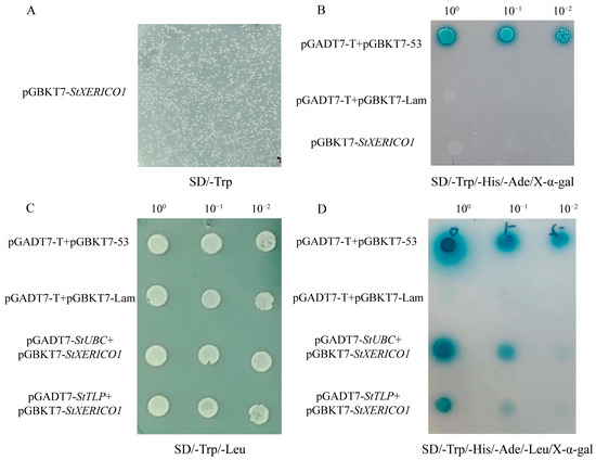 Using the STRING Online software (version: 11.0), which is designed to predict protein interactions, we screened two high-scoring interactions involving StUBC and StTLP proteins. StUBC (accession number Soltu.DM.03G022950.1) is annotated as an E2 ubiquitin ligase, while StTLP (accession number Soltu.DM.09G022900.1) is characterized as a Tubby-like protein [26]. The results from the yeast two-hybrid assay showed that the pGBKT7-StXERICO1 grew colonies on SD/-Trp media, indicating that the pGBKT7-StXERICO1 prey vector did not exhibit toxicity (Figure 14A). The pGBKT7-StXERICO1 construct did not yield colonies on SD/-Trp/-His/-Ade triple-deficient media with X-α-gal, indicating that pGBKT7-StXERICO1 did not exhibit self-activating activity (Figure 14B). The positive control (pGADT7-T+pGBKT7-53) and experimental groups (pGBKT7-StXERICO1+pGADT7-StUBC, pGBKT7-StXERICO1+ pGADT7-StTLP) grew colonies on both two- and four-deficient media with X-α-gal, and the colonies turned blue on four-deficient media coated with X-α-gal. In contrast, the negative control (pGADT7-T+pGBKT7-lam) group formed colonies on two-deficient media but did not grow colonies on all four-deficient media (Figure 14C,D), suggesting an interaction between the StXERICO1-StUBC and StXERICO1-StTLP modules.