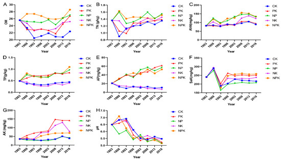 The results indicated that chemical fertilizers significantly changed the soil properties. The soil organic matter (SOM) of CK decreased from 25.6 g kg−1 (1983) to 22.25 g kg−1 (2018) (p > 0.05). Further long-term NPK application showed a non-significant change in SOM (Figure 1B). The TN content of nitrogen fertilizer treatment fluctuated slightly with the prolongation of planting time but showed an increasing trend, and the NP group significantly increased TN in all nitrogen fertilizer treatments. AhN in CK and PK did not increase or decrease significantly during the entire experimental period, while for NP and NPK, AhN content increased by 62.78% and 64.46%, respectively. The TP and AP results showed that long-term P-free fertilizer resulted in serious phosphorus depletion in soil. Compared with the pre-planting year (1983), the TP increased by 73.47–122.90%, and the AP increased by 153.14–196.84% in P-contained groups (Figure 1 D,E). The content of SaK content stabilized after 1998. The K-contained groups had higher Sak levels than those of K-free groups (Figure 1F). The content of AK increased in PK, NK, and NPK, and decreased in the K-free groups (CK and NP) (Figure 1G). Additionally, we found that the soil pH value decreased substantially from 1983 to 2018 in all treatments (Figure 1H).