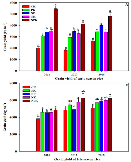 The rice grain yields significantly (p < 0.05) higher with fertilizers application than in CK (Figure 2A). NP treatment had higher yields than NK and PK in 2017 and 2018. In 2016, the early-season rice grain yield in NP was close to NK but still higher than PK. As for late-season rice, NPK had the highest yield and CK had the lowest grain yield (Figure 2B).