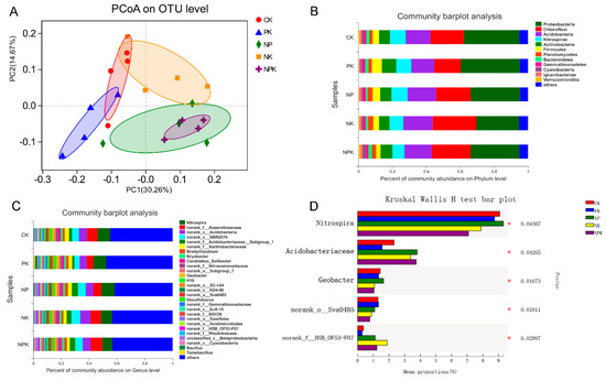 At the phylum level, proteobacteria, chloroflexi, acidobacteria, nitrospirase, and actinobacteria were the top 5 abundant bacteria in all groups. The total abundance of these five bacteria was >80% in each group (Figure 3A). As for genus level, Nitrospira, norank_f_Anaerolineaceae, norank_c_Acidobacteria, norank_c_SBR2076, norank_f_Acidobacteriaceae_Subgroup_1_ and norank_f_Xanthobacteraceae were the genera in each group (Figure 3B). We also found that the abundance of norank_f_Acidobacteriaceae_Subgroup_1, norank_f_Xanthobacteraceae, norank_f_Nitrosomonadaceae and Geobacterwere was significantly different in NPK vs. CK (Figure 3C). In addition, norank_c_SBR2076, norank_f_Acidobacteriaceae_Subgroup_1, and norank_o_SC-I-84 showed significantly different abundance between PK and NK, of which norank_f_Acidobacteriaceae_Subgroup_1_ in PK was significantly lower than that in NPK (Figure 3C,D). Geobacter in NP showed a higher abundance compared with NK and NPK (Figure 3C). Similarly, Nitrospira and norank_f_Xanthobacteraceae in NK had a higher abundance than that in NPK (Figure 3D). There were no significant differences in bacteria found in abundance between the other pairwise comparisons.