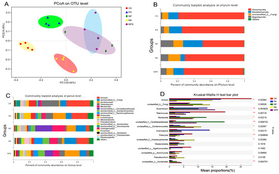 Distribution of fungal community in different groups. (A) shows the PCoA results on the OTU level. (B,C) note the fungi community at the phylum and genus levels. (D) shows the Kruskal–Wallis test results among all the groups. * and ** indicates the significance at p < 0.01 and p < 0.05 levels.