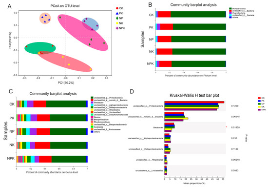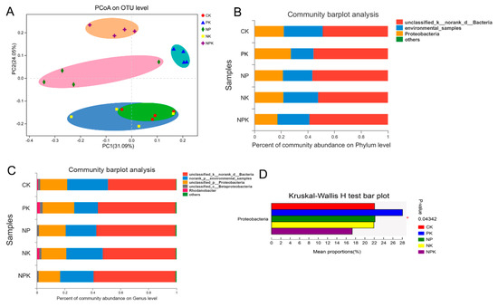 Distribution of nitrogen-fixing bacteria in different groups. (A) shows the PCoA results on the OTU level. (B,C) note the bacteria community at the phylum and genus levels. (D) shows the Kruskal–Wallis test results among all the groups. * indicates the significance at p < 0.01 level.