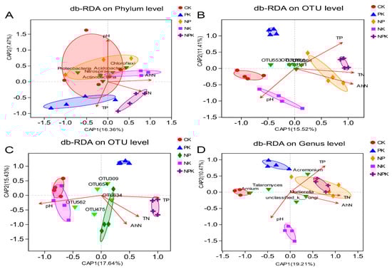 Distance-based redundancy analysis (db-RDA) results. (A–D) note the db-RDA results of bacteria, nitrogen-fixing bacteria, denitrifying bacteria, and fungi, respectively.