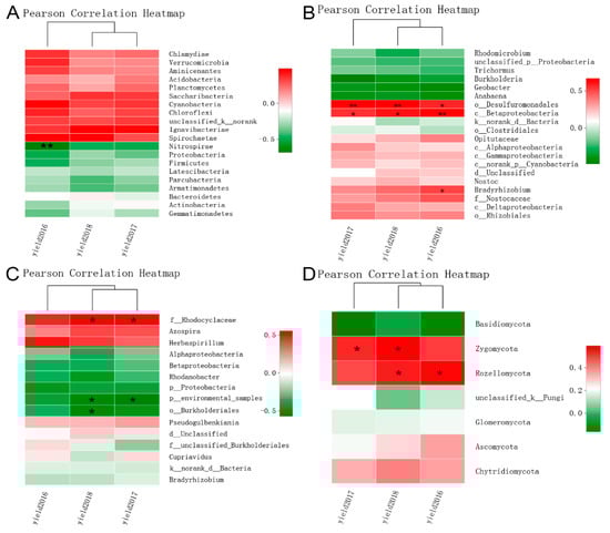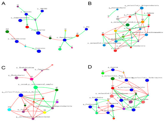 Two-way correlation network analysis. (A–D) note the two-way correlation network analysis results of bacteria, nitrogen-fixing bacteria, denitrifying bacteria, and fungi, respectively. The red and green lines represent positive and negative correlations, respectively.