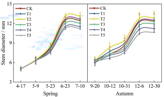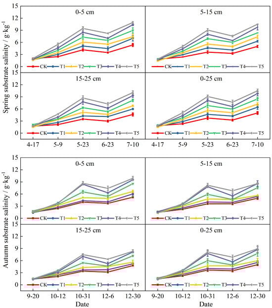 Figure 2 illustrates the dynamic changes in salt content within the 0–25 cm substrate layer under varying irrigation water salinity levels during the spring and autumn seasons. It was observed that salt content decreased with depth in all treatments at different growth stages, with salinity remaining high in the surface layer. At the same irrigation rate, the average salinity of 0–25 cm substrate with different mineralization levels of irrigation water showed an increasing, decreasing and finally, increasing trend with fertility progressed, reaching a peak at the end of the fruiting stage. The average substrate salinity of the CK-T5 treatments reached 4.99, 5.99, 6.58, 8.13, 9.29, and 9.71 g·kg−1 between the two seasons, respectively. The average substrate salt content progressively increased with higher irrigation water salinity throughout the growth stage. The salt accumulation effect was more obvious in the T3, T4, and T5 treatments, with the average salinity of the substrate as high as 5.05, 5.78, and 6.32 g·kg−1, which increased by 59.5%, 82.5%, and 99.5% in T3, T4, and T5 treatments, respectively, as compared with the CK treatment between the two seasons. This indicated that the average substrate salt content progressively increased with higher irrigation water salinity throughout the growth stage.