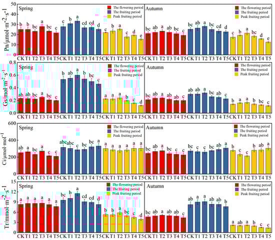 Effects of different irrigation water salinity levels on net photosynthetic rate, stomatal conductance, inter-cellular CO2 concentration, and transpiration rate in leaves of tomato grown in sand culture during the spring and fall seasons. (The values reported in Figure 3 are the mean of three replicates of each indicator. The error line indicates the standard error of the three replicate values. Different lowercase letters indicate significant differences among treatments at p < 0.05).
